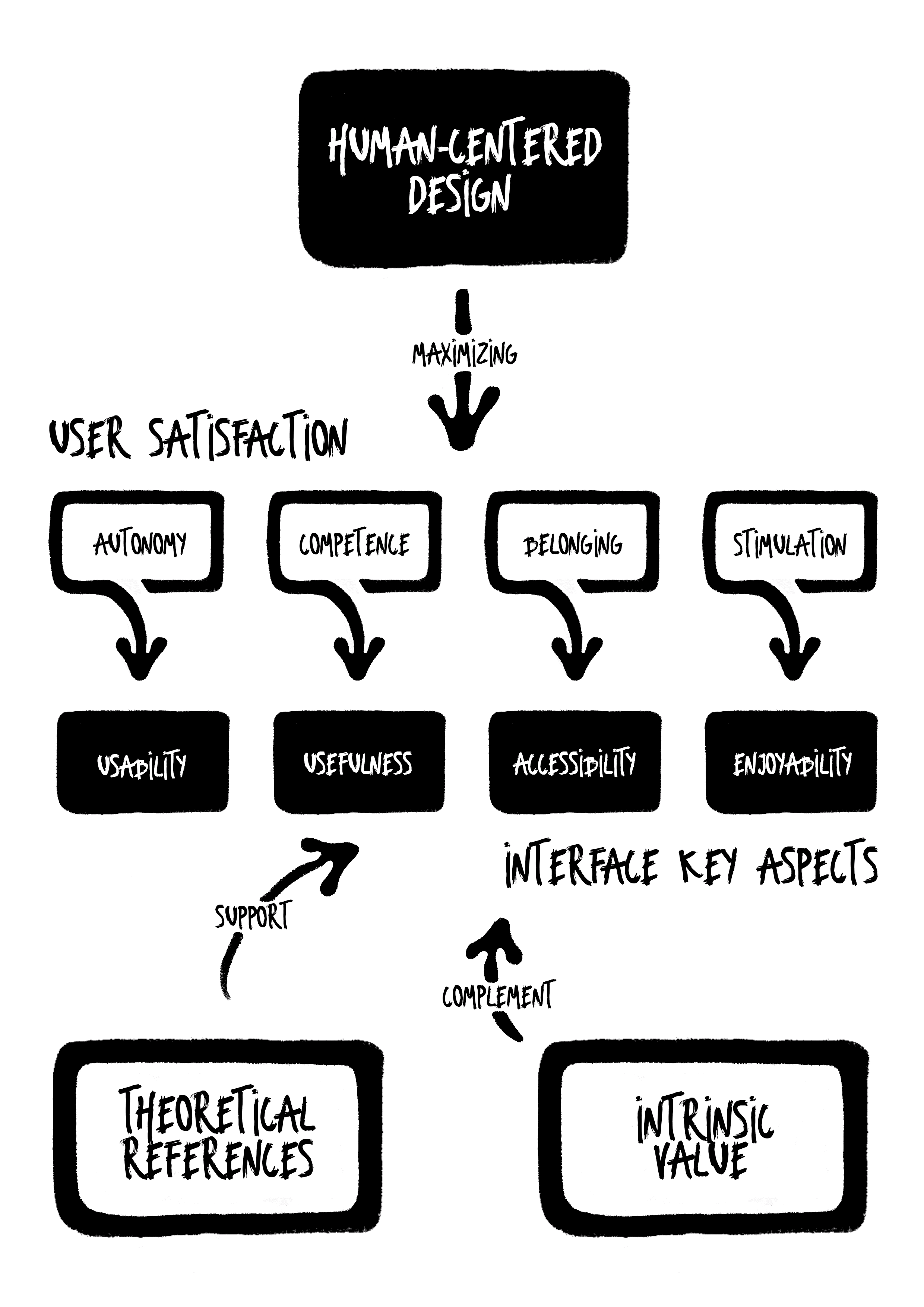 Correlacionaremos a ideia de autonomia com a ideia de usabilidade, que visa fazer com que interações ocorram da maneira mais fluida e fácil possível para o usuário; a ideia de competência associaremos a ideia de utilidade, que dirá respeito à efetividade da interface em promover a atividade alvo daquela interação; a ideia de pertencimento será correlacionada a ideia de acessibilidade, que pauta as medidas necessarias para que grupos de usuários relevantes ao artefato tecnológico sejam capazes de utilizá-lo normalmente; e por fim associaremos a ideia de estímulo à ideia de agradabilidade, que dirá respeito à diversão e outras sensações positivas que a interação a partir da interface trará ao usuário.